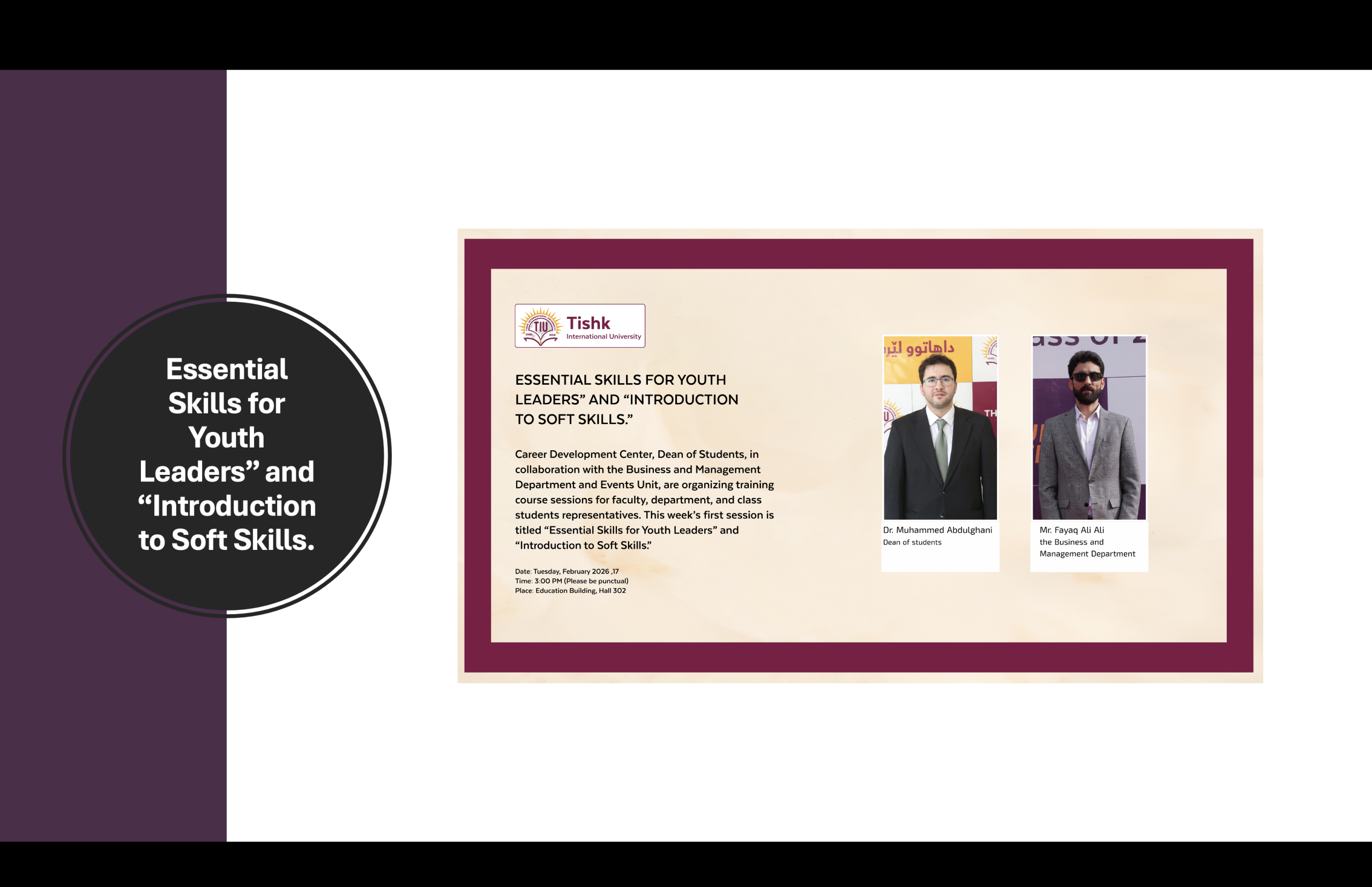 Tishk International University (TIU), through its Career Development Center (CDC) under the Dean of Students, in collaboration with the Business and Management Department and the Events Unit, successfully launched the first session of its training program titled “Essential Skills for Youth Leaders” and “Introduction to Soft Skills.”